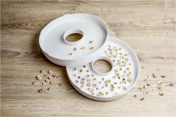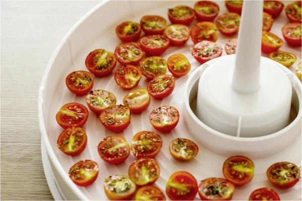 Obst, Gemüse, Pilze und Kräuter trocknen gleichmäßig im heißen Luftstrom, völlig ohne Konservierungsstoffe. Vitamine, Nährstoffeund Mineralien bleiben erhalten, Aromastoffe werden konzentriert.Perfekt zur Herstellung getrockneter Zutaten für Müsli, Suppen, Saucen, Tees und Snacks, aber auch natürlicher Deko-Materialien aus getrockneten Früchten etc.